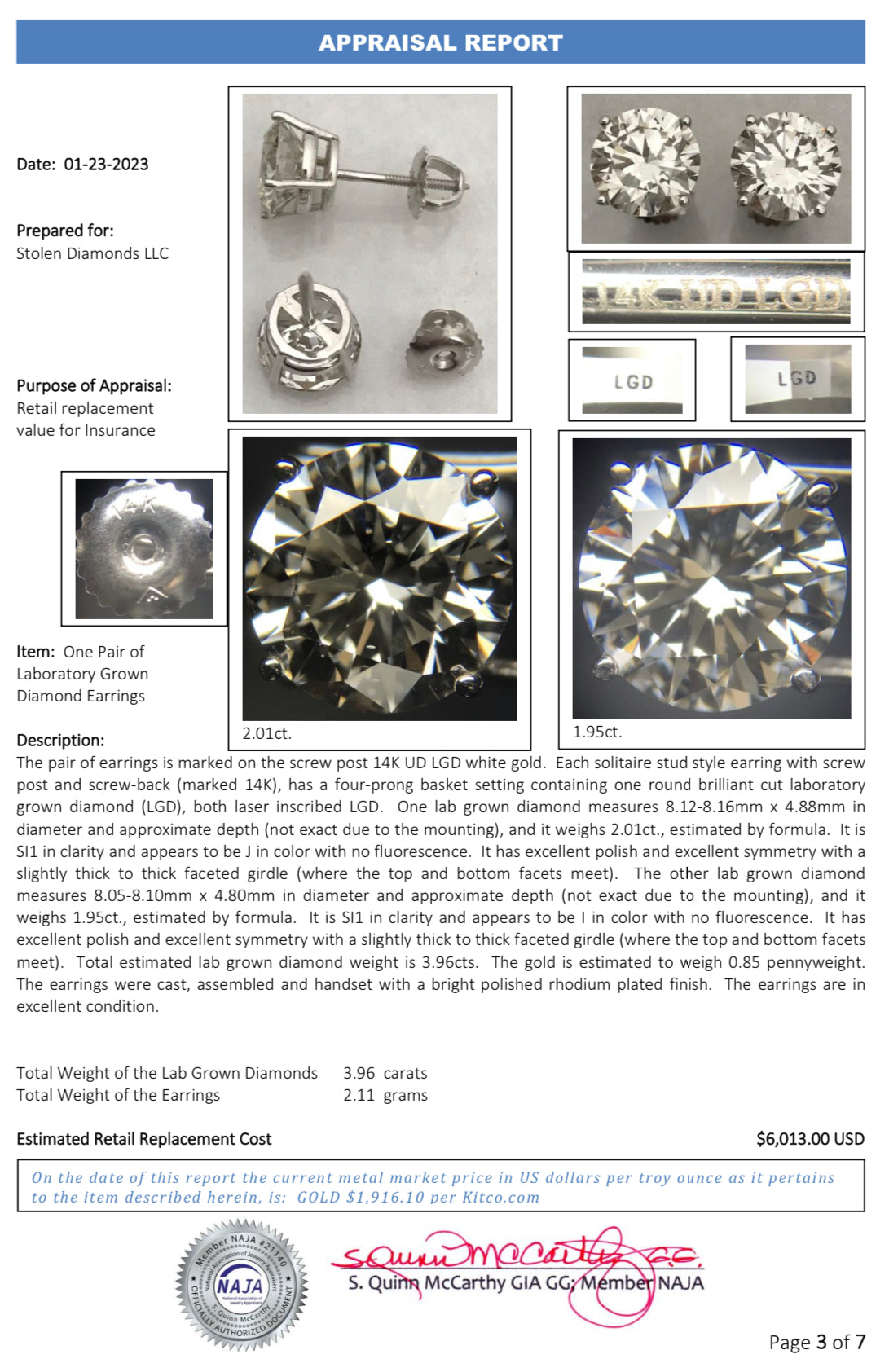 14K 3.96 CTW Lab Grown Diamond Stud Earrings w/Appraisal